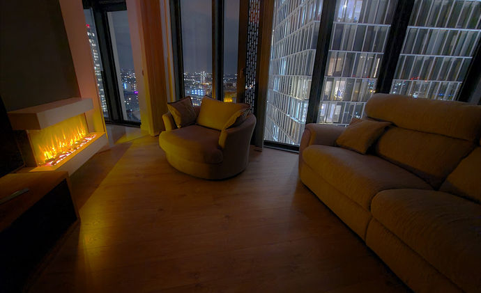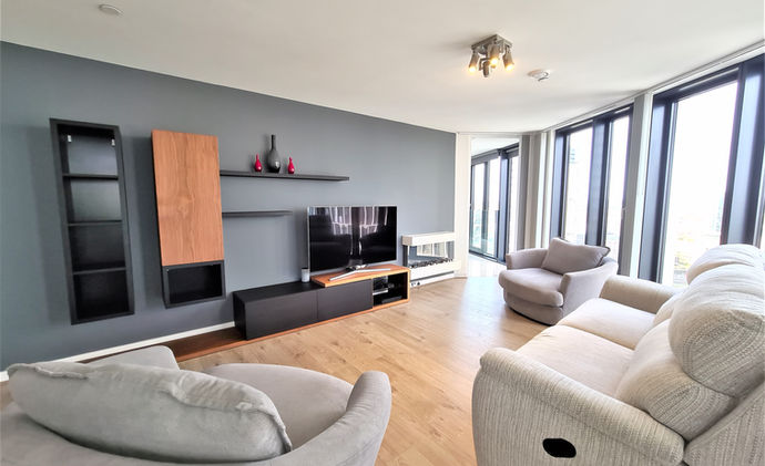 The flat comprises of 2 generously sized double bedrooms, the master bedroom with en-suit and a TV-bed; a family bathroom; a modern kitchen and open plan living area with fireplace, furnished to a very high standard; and a glazed winter garden/balcony, allowing every single room to benefit from the amazing views. Featuring the highest quality appliances and designer brand names throughout. High spec kitchens include handle-less fitted units, engineered stone worktops, glass splash backs and fully integrated appliances. The winter garden is a wonderful, multifunctional space with underfloor heating. As seen in the pictures, it can be used as a study/home office. Superfast broadband is included in the price. The building offers 24-hour concierge service and access to the roof terrace for residents only.