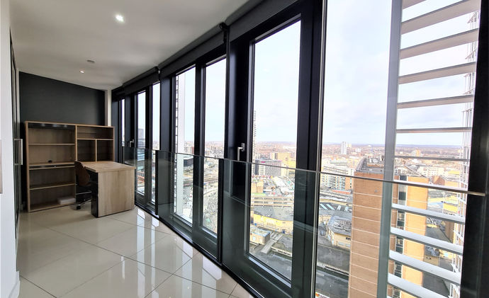A luxurious, fully furnished larger than average 2-bedroom 2-bathroom apartment with a unique winter garden/enclosed balcony offered to rent on the 18th floor of the Unex Tower development. The winter garden is currently furnished as a study/home office and superfast broadband is included in the price, which are ideal for working from home. Right next to Stratford station, with floor to ceiling windows, the flat offers amazing views across the city skyline and second to none transport links to almost any part of London.
